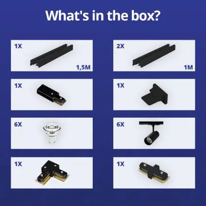 | Fabrikantnaam | Complete L shaped 1-Phase Track Set Black incl. 6x Spot fixture + GU10 2700K 3W Dim – 1,5 x 2 meter | |