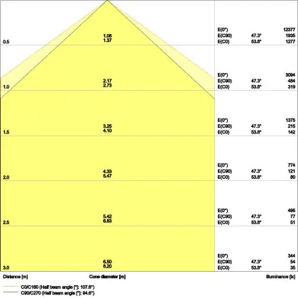 De gradenbundel geeft informatie over hoe breed het licht wordt uitgestraald. Dit zit tussen de 0 en 360 graden (D). Hoe kleiner de hoek, hoe specifieker de lichtbundel is. Over het algemeen is een smalle gradenbundel perfect voor sfeer- of accentverlichting, terwijl een brede gradenbundel ideaal is om grote oppervlaktes te verlichten.