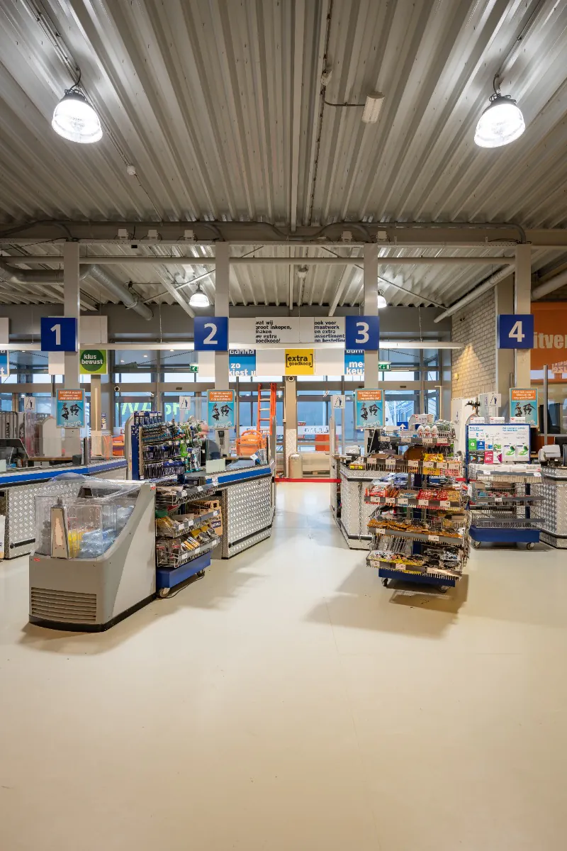 Als eerste plaatsten we armaturen van Noxion die samen zorgden voor een goed verlichte en comfortabele winkelomgeving. Het is belangrijk dat de winkel goed verlicht wordt, omdat zichtbaar licht een enorme impact heeft op hoe we de winkel emotioneel ervaren. Onbewust worden we namelijk aangetrokken door goed verlichte winkels en producten. We plaatsen ook LED highbays met speciaal gekozen reflectors, die ervoor zorgden dat het licht goed verspreid werd. Hierdoor worden alle producten goed verlicht. Aangezien de deksel en kap van de highbay prismatisch zijn afgesloten, kun je niet verblind worden door de verlichting.